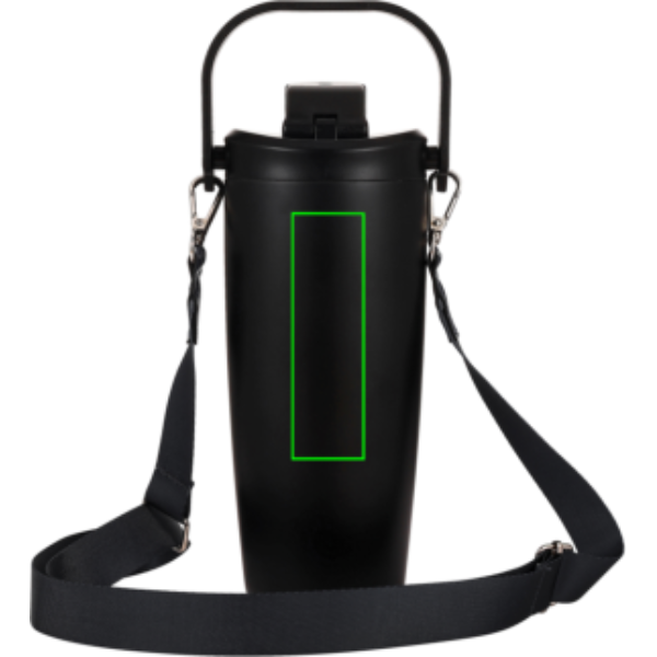 Doppelwandige Isolierflasche aus Edelstahl. Verschluss mit Henkel. Füllmenge: 500 ml. Auslaufsicher.