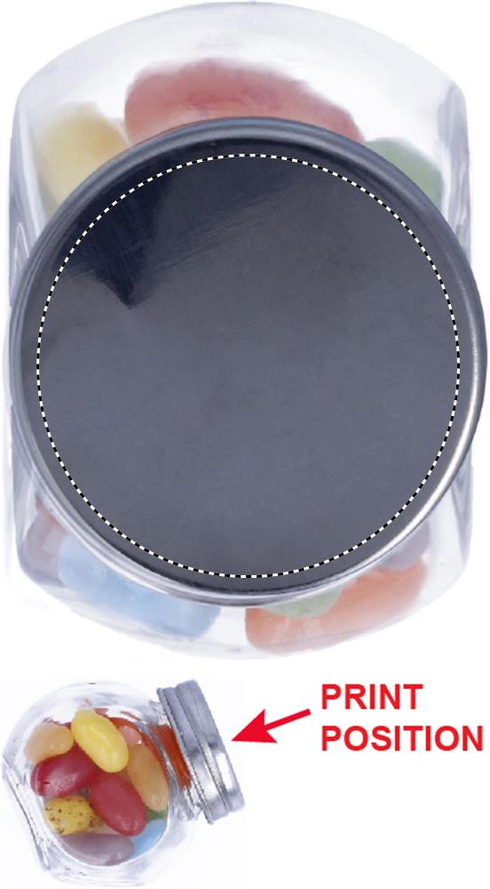 Bunte Geleebonbons im Glasspender mit Metalldeckel. Inhalt: 40 g.