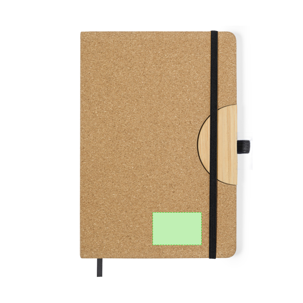 Notebook mit Hardcover aus Kork und mit vielseitiger Smartphone- und Tablet-Halterung im Vorderdeckel integriert. Inklusive elastischem Verschlussband und passendem Stifthalter in schwarzer Farbe. 100 Innenblätter mit Einzelstreifen-Layout, verpackt in einer einzelnen recycelten Tasche.