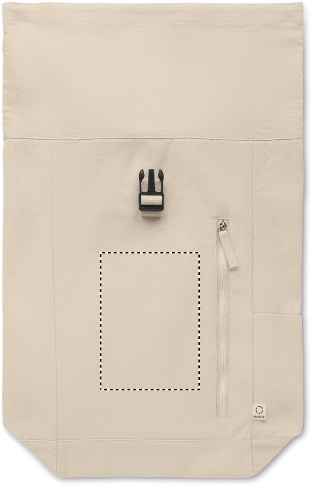 Rolltop-Rucksack mit Klettverschluss aus 390 g/m² (recycelte Baumwolle 80% und recycelter Polyester 20%). Fronttasche mit Reißverschluss.