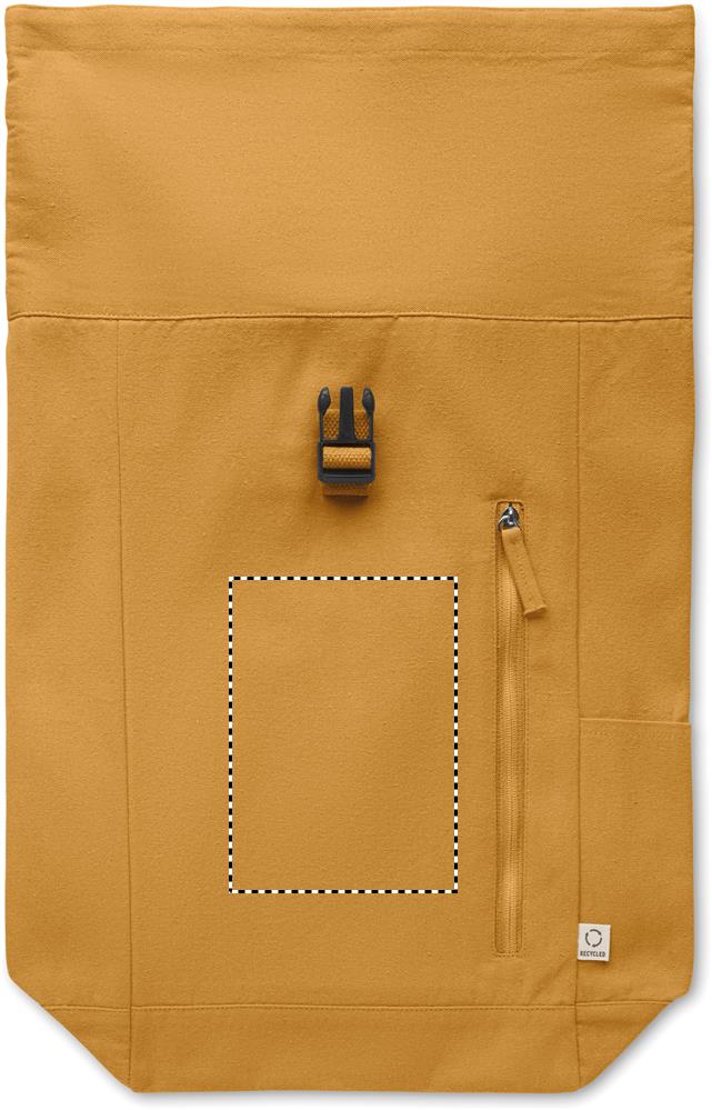 Rolltop-Rucksack mit Klettverschluss aus 390 g/m² (recycelte Baumwolle 80% und recycelter Polyester 20%). Fronttasche mit Reißverschluss.