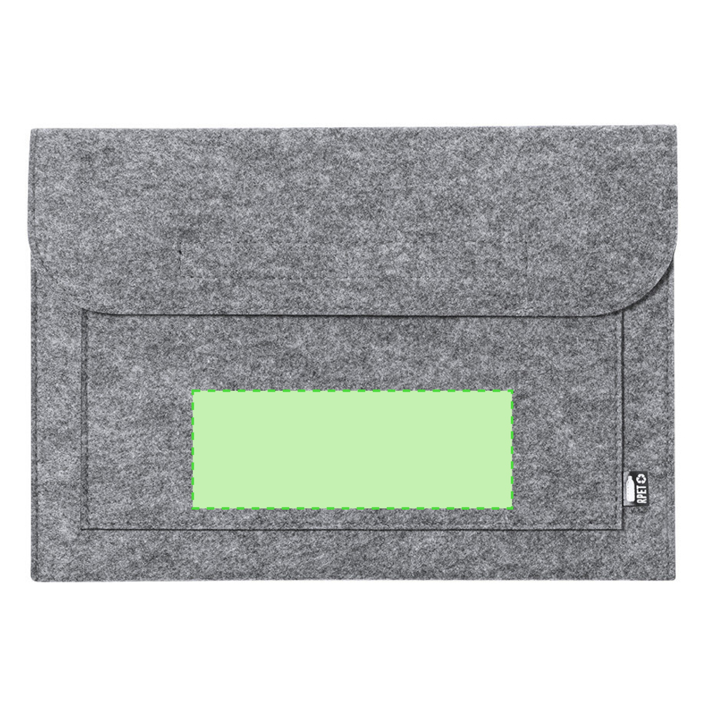 Laptophülle der Liene "Natur" aus widerstandsfähigem recyceltem RPET-Filz, das Ergebnis der Kombination des Recyclingprozesses von Kunststoffmaterialien mit der alten Technik der Filzherstellung, was zu einem Öko-Trend-Material führt, das nicht nur recycelten Ursprungs ist, sondern auch zu recycelbar. Überschlag mit Klettverschlüssen und Fronttasche, mit markantem RPET auf dem Außenetikett.