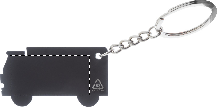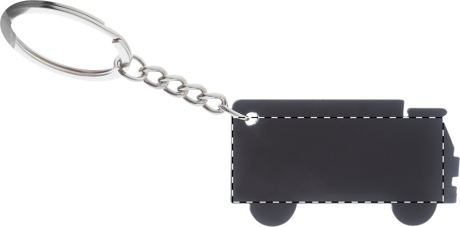 Schlüsselanhänger in LKW-Form aus recyceltem Edelstahl mit gummierter Oberfläche undspezieller Beschichtung für Spiegelgravuren.