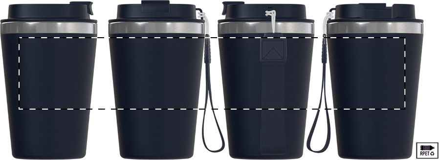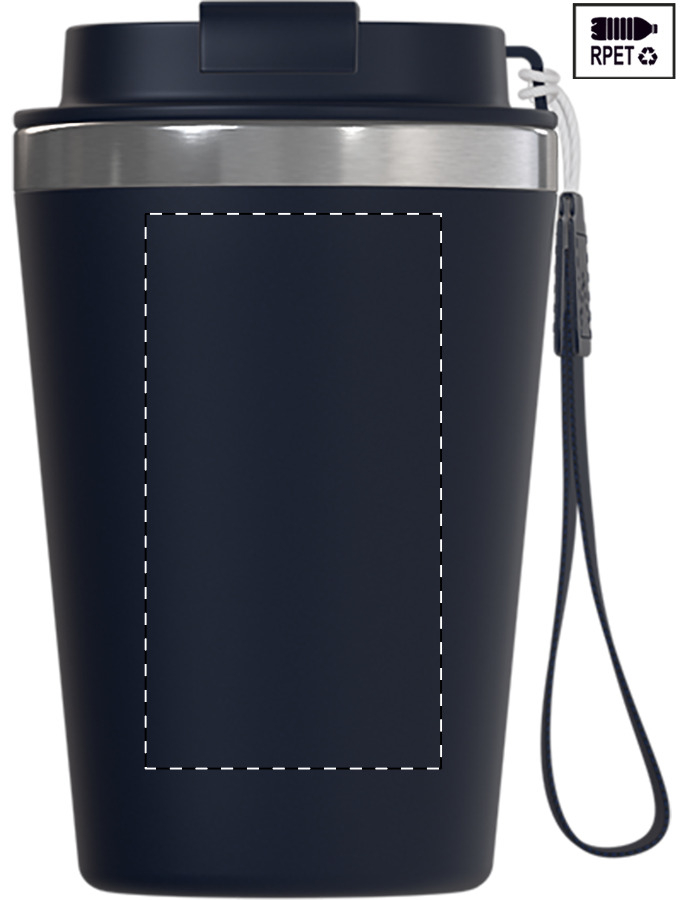 Doppelwandiger, Isolierbecher aus recyceltem Edelstahl mit PP-Kunststoffaußenseite und Trinkdeckel. Mit RPET-Griffschlaufe. Füllmenge: 350 ml.