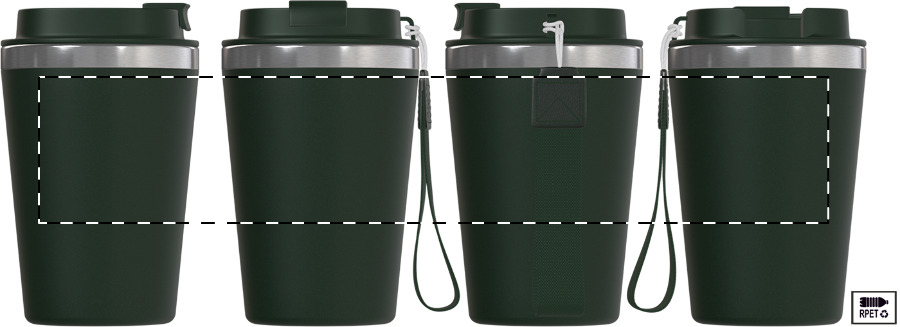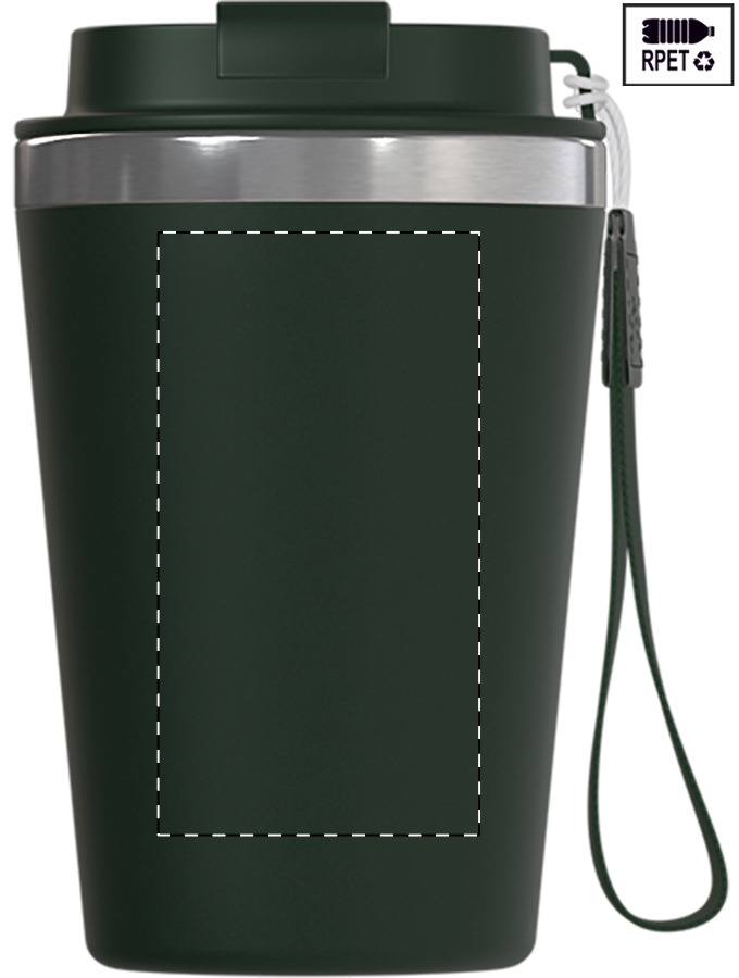 Doppelwandiger, Isolierbecher aus recyceltem Edelstahl mit PP-Kunststoffaußenseite und Trinkdeckel. Mit RPET-Griffschlaufe. Füllmenge: 350 ml.