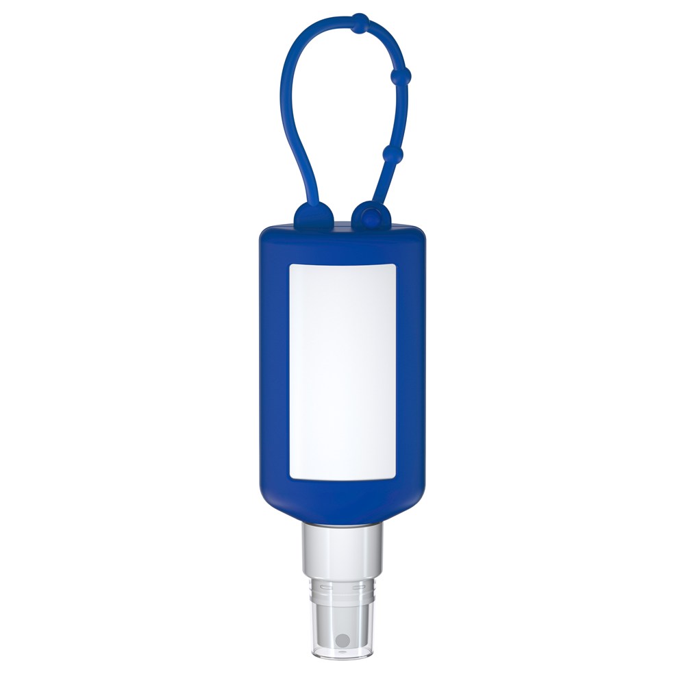 50 ml PET Flasche (weiß) mit weißem Pumpaufsatz und transparenter Schutzkappe; Silikonhülle und Schlaufe in blau. Nachfüllbar. Flasche hergestellt aus 100% recyceltem PET, weiß mit leichter R-PET-Färbung.