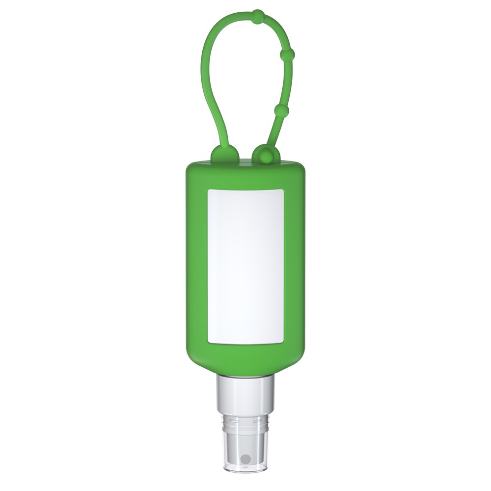 50 ml PET Flasche (weiß) mit weißem Pumpaufsatz und transparenter Schutzkappe; Silikonhülle und Schlaufe in grün. Nachfüllbar. Flasche hergestellt aus 100% recyceltem PET, weiß mit leichter R-PET-Färbung.