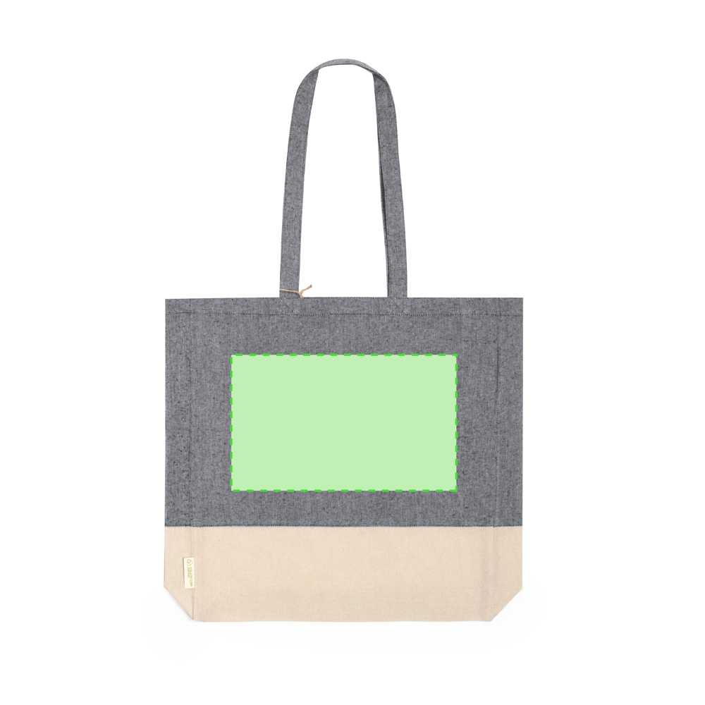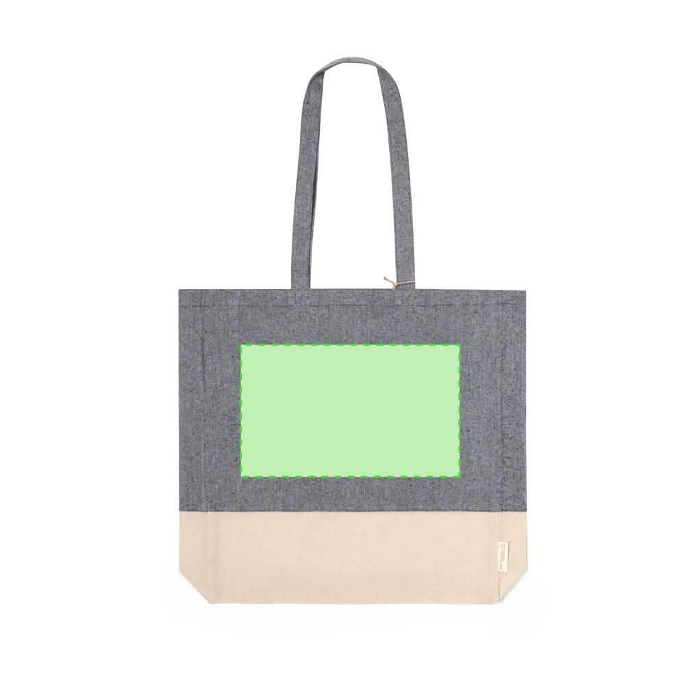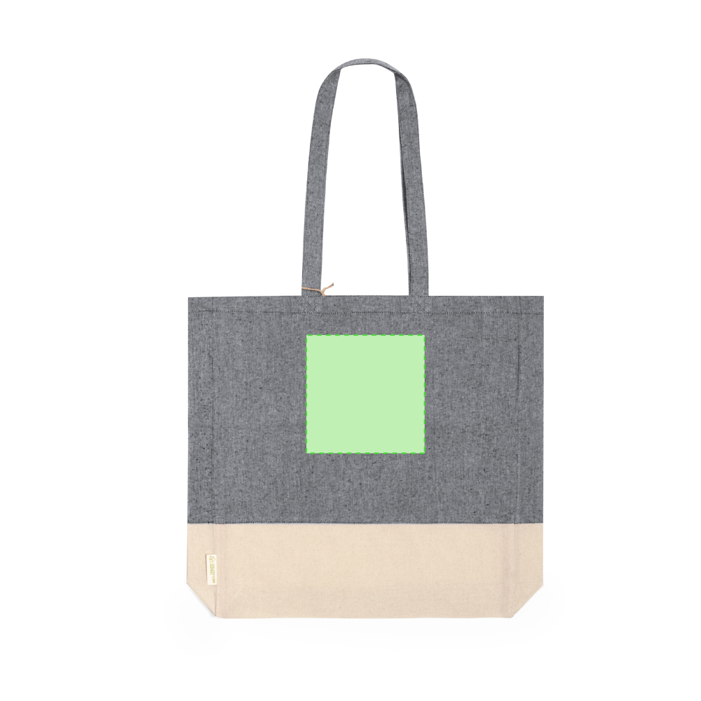 Tasche aus recycelter Baumwolle 120 g/m2. 70 cm lange Griffe mit Verstärkung, genähtem Finish und Zwickel. Recycelte Baumwolle-Logo und Belastbar bis zu 8 kg Gewicht. Erhältlich in einer breiten Palette von Öko-Farben, kombiniert mit einem natürlichen Boden.