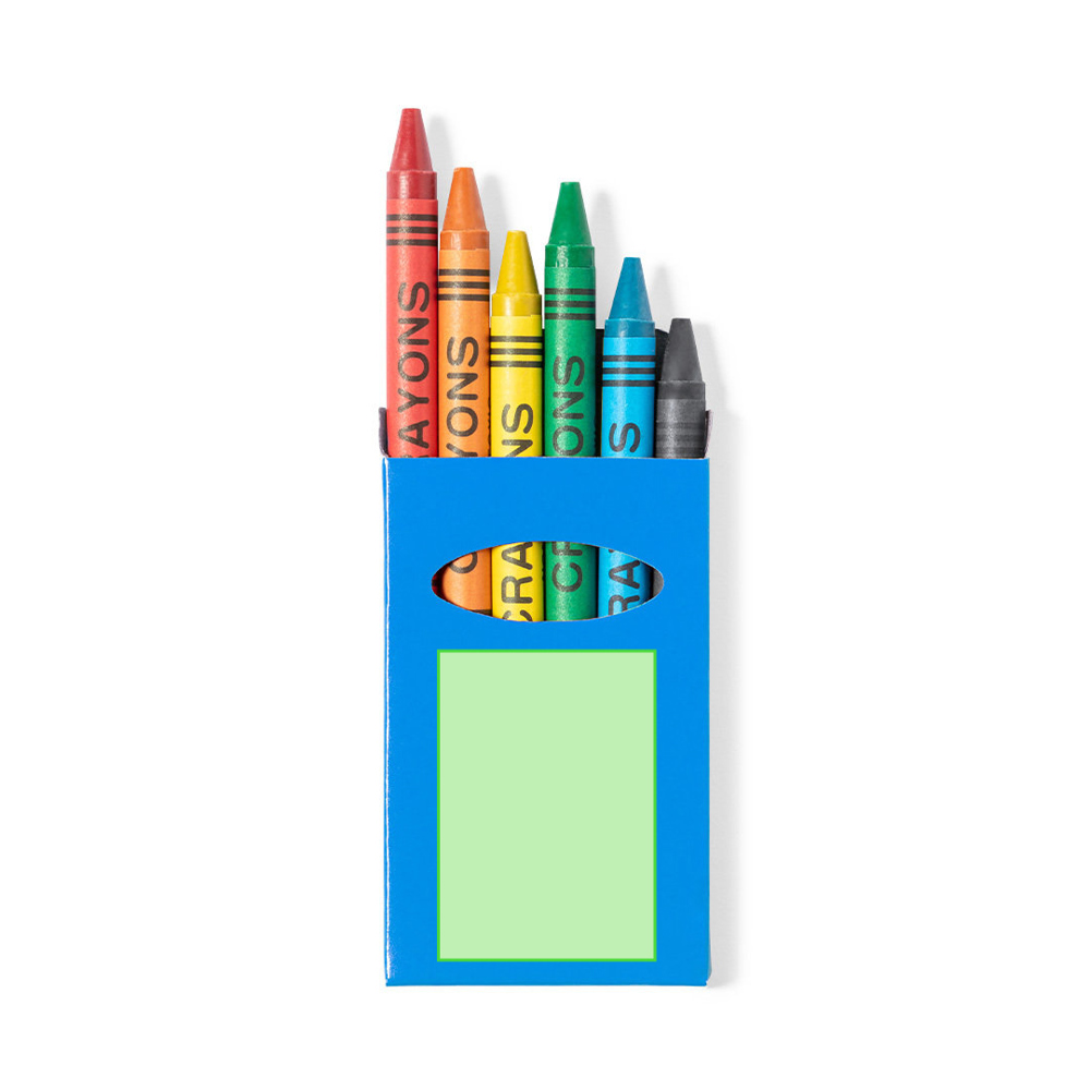 Set aus 6 Wachsmalstiften in einer Schachtel aus glänzendem Karton in lebendigen Farben mit Fenster. Mit zylinderförmigem Körper in verschiedenen Farben. In den Farben Rot, Grün, Gelb, Blau, Schwarz und Orange.